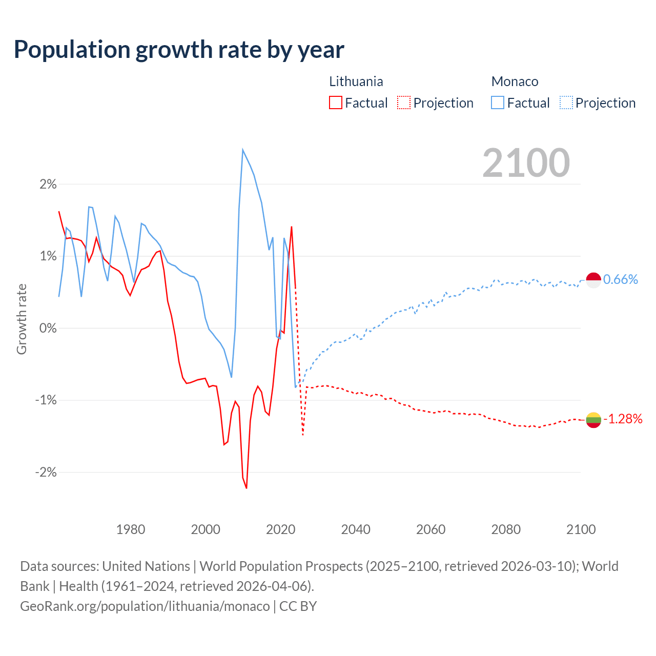 - For the last 10 years, Lithuania has had an average growth rate of -0.22% per year vs +0.79% in Monaco.