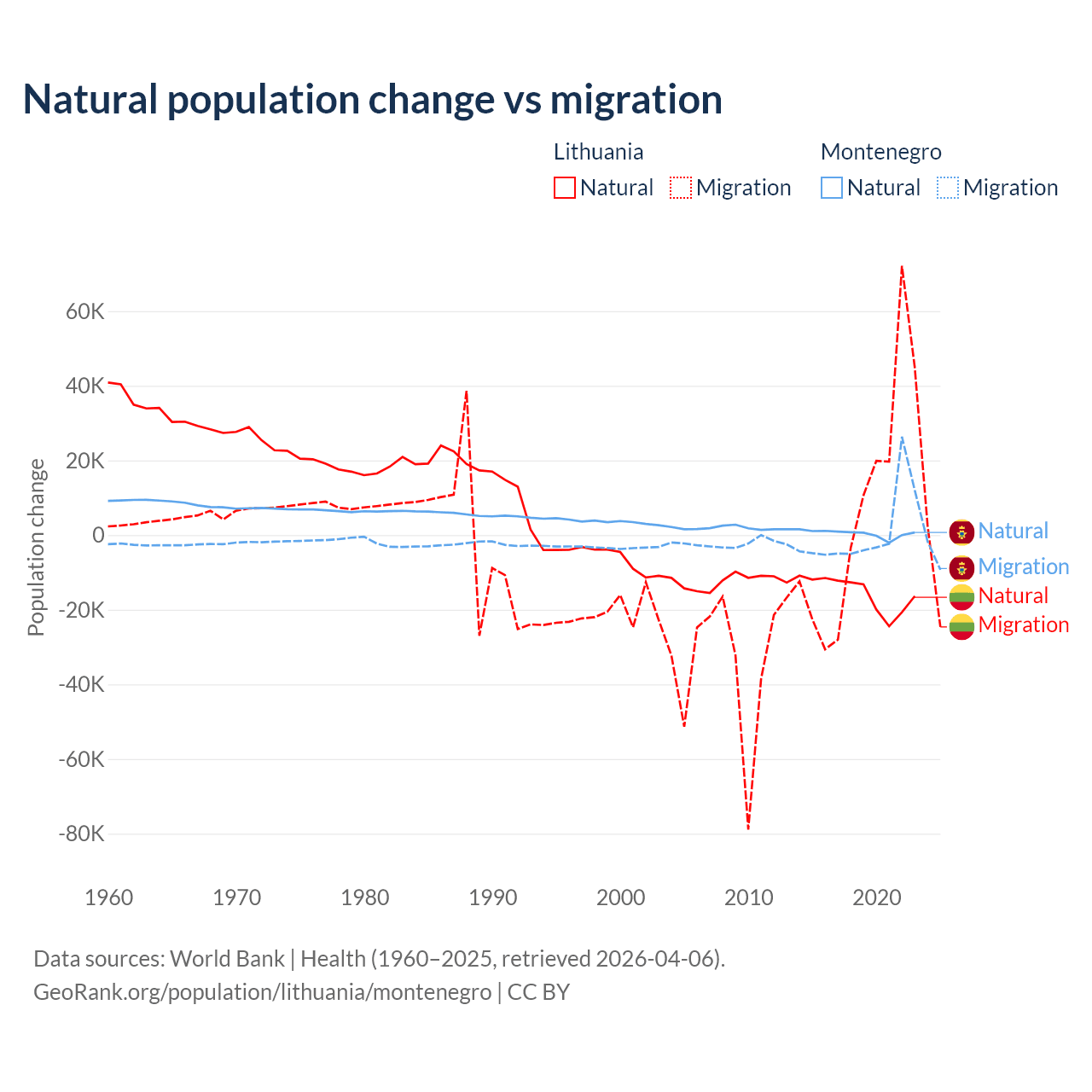 Over the last 10 years, 68.7% of the population change in Lithuania is from natural causes (a loss of 153,859 people) and 31.3% is from migration (a gain of 70,196 people). In Montenegro 52.4% is from natural causes (a gain of 4,501 people) and 47.6% is from migration (a gain of 4,095 people).