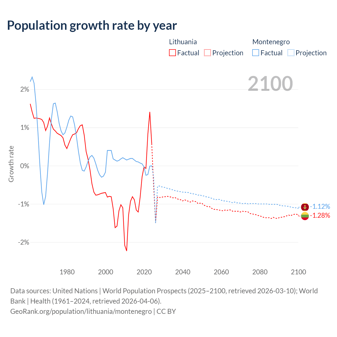 - For the last 10 years, Lithuania has had an average growth rate of -0.22% per year vs +0.01% in Montenegro.
