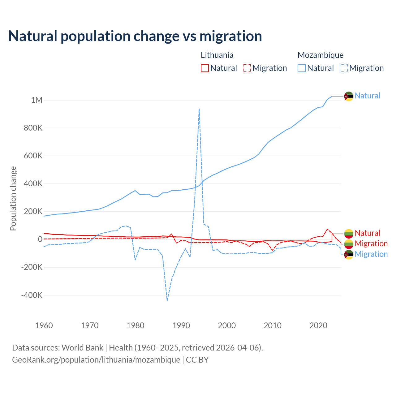 Over the last 10 years, 68.7% of the population change in Lithuania is from natural causes (a loss of 153,859 people) and 31.3% is from migration (a gain of 70,196 people). In Mozambique 95.9% is from natural causes (a gain of 9,108,203 people) and 4.15% is from migration (a loss of 393,923 people).