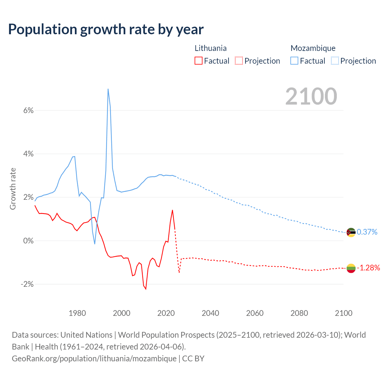 - For the last 10 years, Lithuania has had an average growth rate of -0.22% per year vs +2.99% in Mozambique.