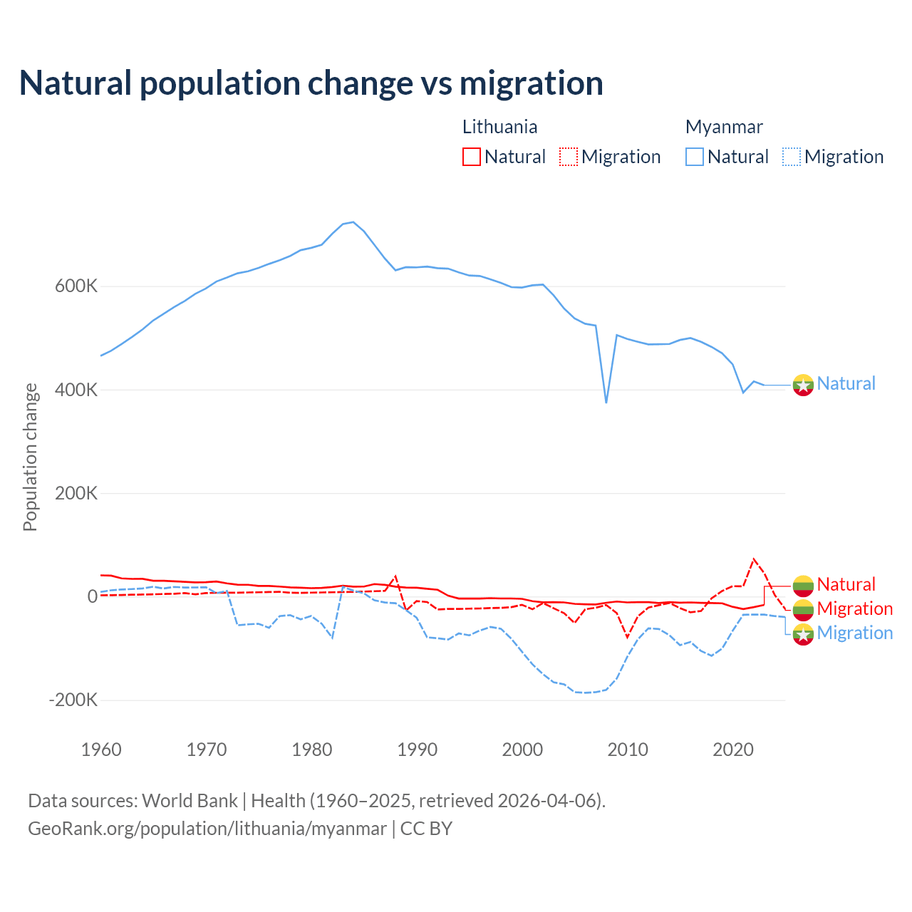Over the last 10 years, 68.7% of the population change in Lithuania is from natural causes (a loss of 153,859 people) and 31.3% is from migration (a gain of 70,196 people). In Myanmar 86% is from natural causes (a gain of 4,594,615 people) and 14% is from migration (a loss of 749,272 people).