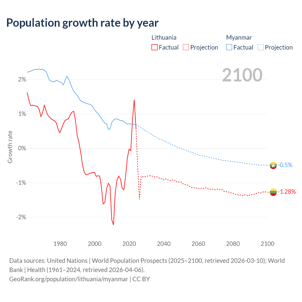 - For the last 10 years, Lithuania has had an average growth rate of -0.22% per year vs +0.74% in Myanmar.