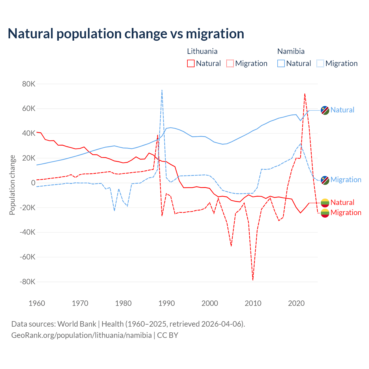 Over the last 10 years, 68.7% of the population change in Lithuania is from natural causes (a loss of 153,859 people) and 31.3% is from migration (a gain of 70,196 people). In Namibia 74.3% is from natural causes (a gain of 532,532 people) and 25.7% is from migration (a gain of 183,837 people).