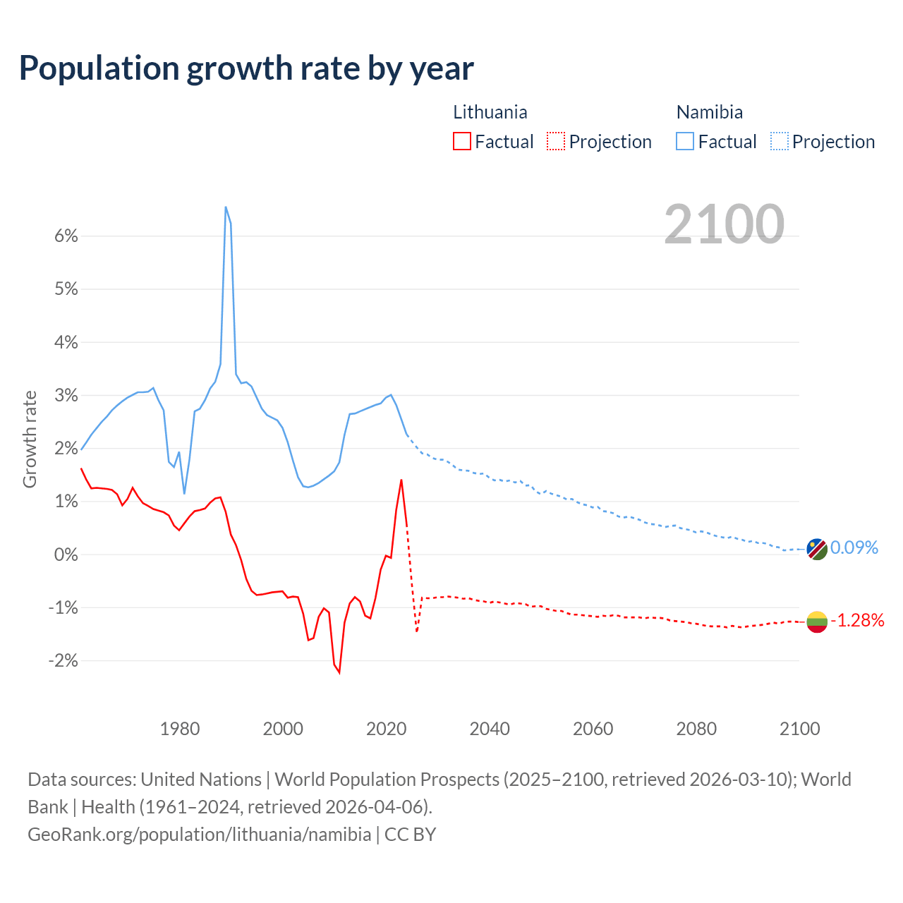 - For the last 10 years, Lithuania has had an average growth rate of -0.22% per year vs +2.73% in Namibia.