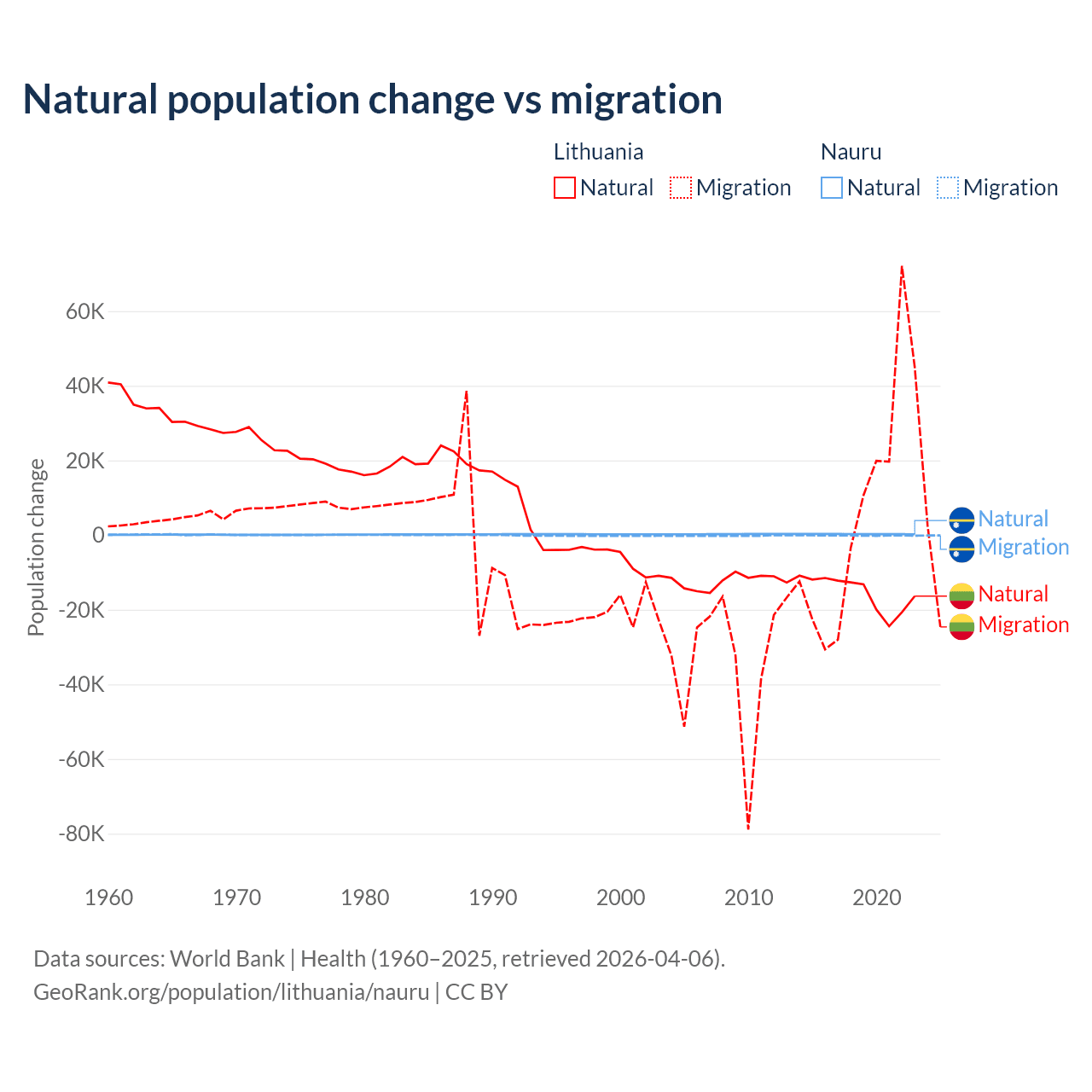 Over the last 10 years, 68.7% of the population change in Lithuania is from natural causes (a loss of 153,859 people) and 31.3% is from migration (a gain of 70,196 people). In Nauru 66.2% is from natural causes (a gain of 2,590 people) and 33.8% is from migration (a loss of 1,320 people).