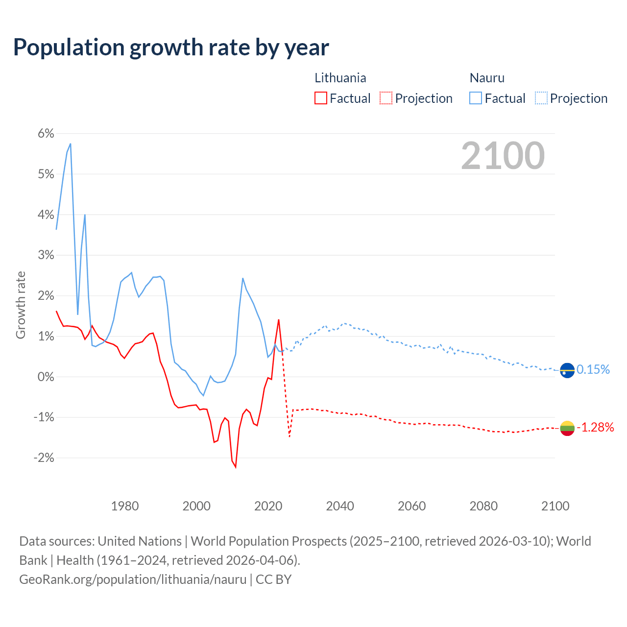 - For the last 10 years, Lithuania has had an average growth rate of -0.22% per year vs +1.17% in Nauru.