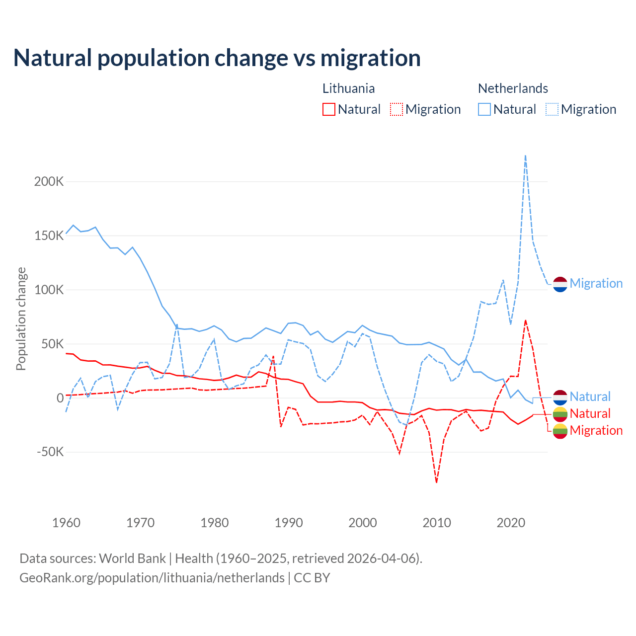 Over the last 10 years, 68.7% of the population change in Lithuania is from natural causes (a loss of 153,859 people) and 31.3% is from migration (a gain of 70,196 people). In the Netherlands 11.8% is from natural causes (a gain of 134,554 people) and 88.2% is from migration (a gain of 1,006,495 people).
