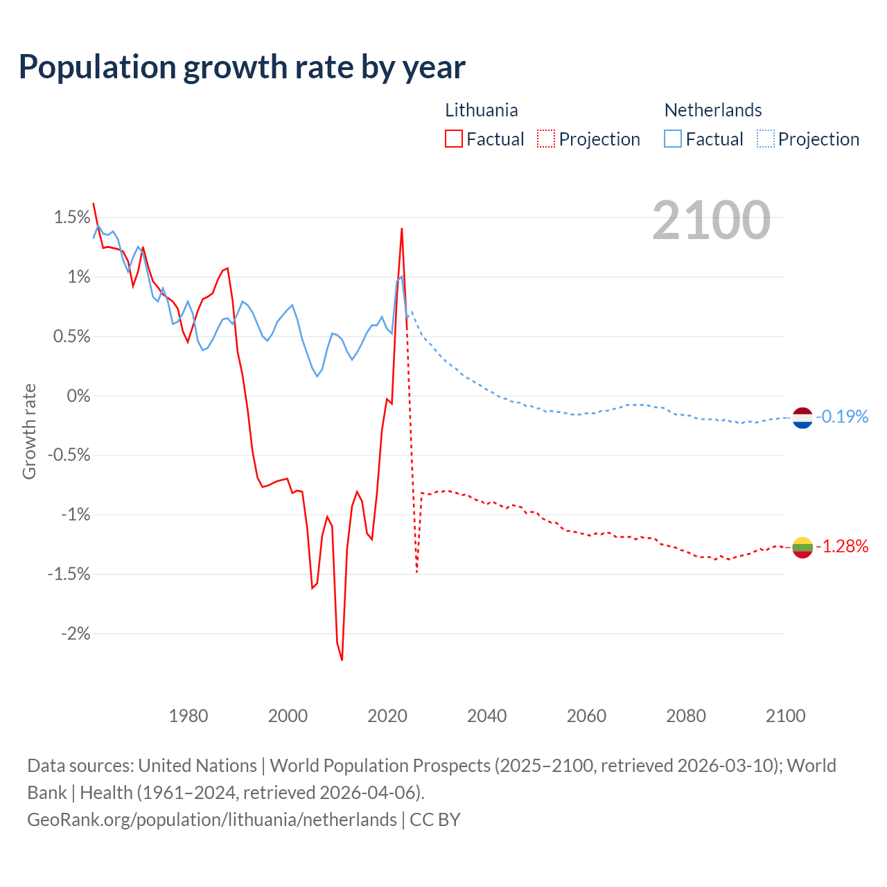 - For the last 10 years, Lithuania has had an average growth rate of -0.22% per year vs +0.62% in the Netherlands.