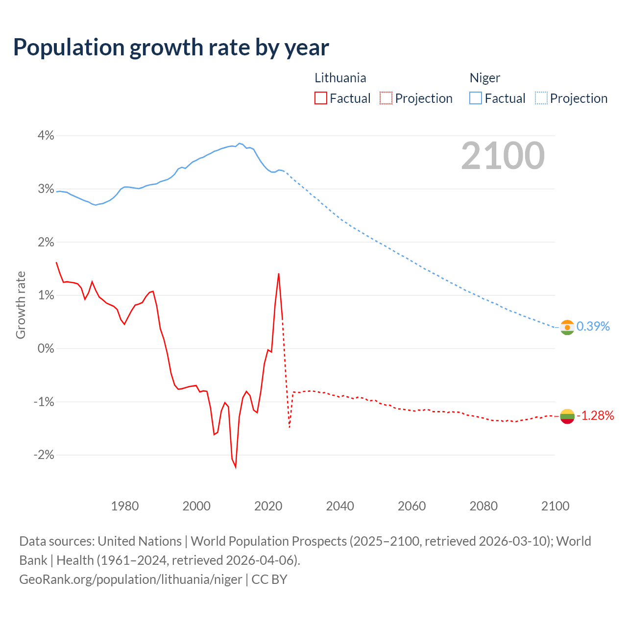 - For the last 10 years, Lithuania has had an average growth rate of -0.22% per year vs +3.5% in Niger.