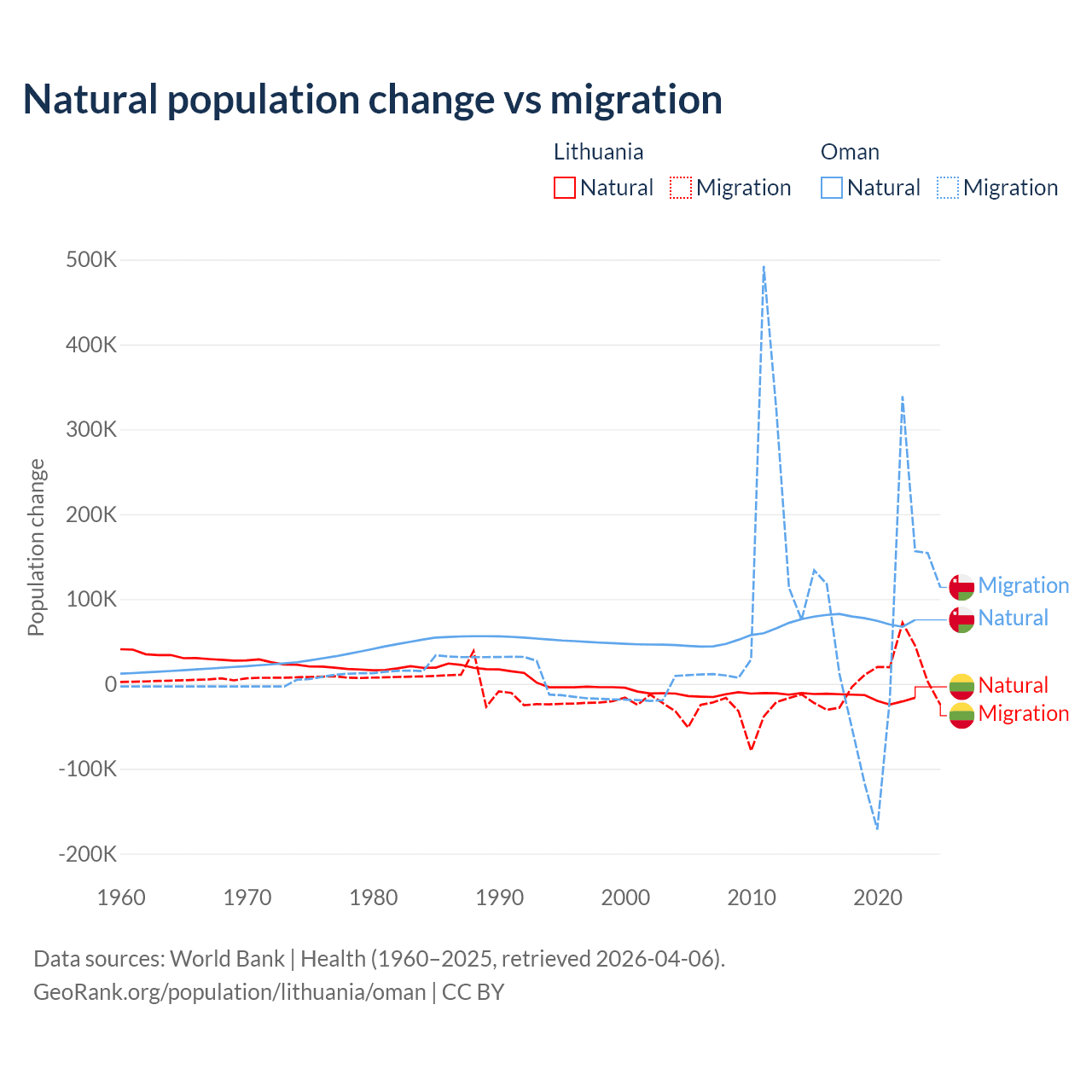 Over the last 10 years, 68.7% of the population change in Lithuania is from natural causes (a loss of 153,859 people) and 31.3% is from migration (a gain of 70,196 people). In Oman 61.6% is from natural causes (a gain of 763,049 people) and 38.4% is from migration (a gain of 475,565 people).