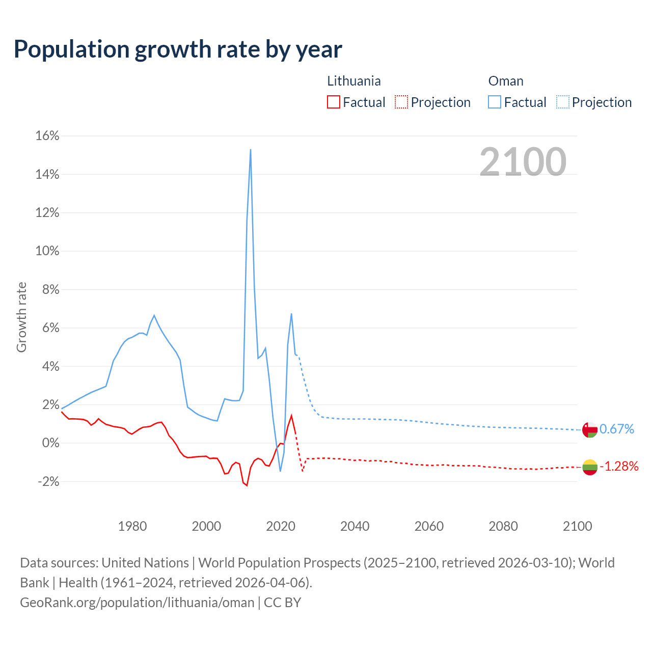 - Since 2006, the population of Lithuania has decreased from 3.27M people to 2.83M (13.5% decline), while Oman has grown from 2.51M to 5.76M (129.1% growth).