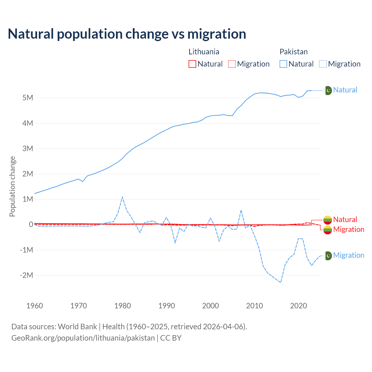 Over the last 10 years, 68.7% of the population change in Lithuania is from natural causes (a loss of 153,859 people) and 31.3% is from migration (a gain of 70,196 people). In Pakistan 77.8% is from natural causes (a gain of 51,255,404 people) and 22.2% is from migration (a loss of 14,629,055 people).
