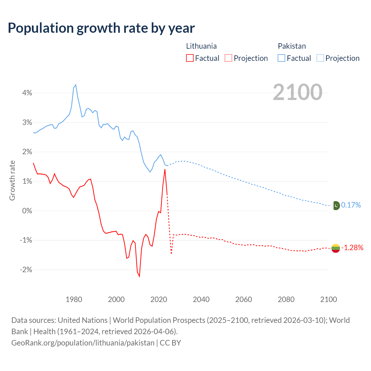 - For the last 10 years, Lithuania has had an average growth rate of -0.22% per year vs +1.6% in Pakistan.