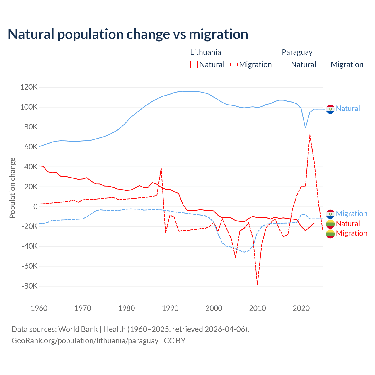 Over the last 10 years, 68.7% of the population change in Lithuania is from natural causes (a loss of 153,859 people) and 31.3% is from migration (a gain of 70,196 people). In Paraguay 87.6% is from natural causes (a gain of 1,002,636 people) and 12.4% is from migration (a loss of 141,377 people).