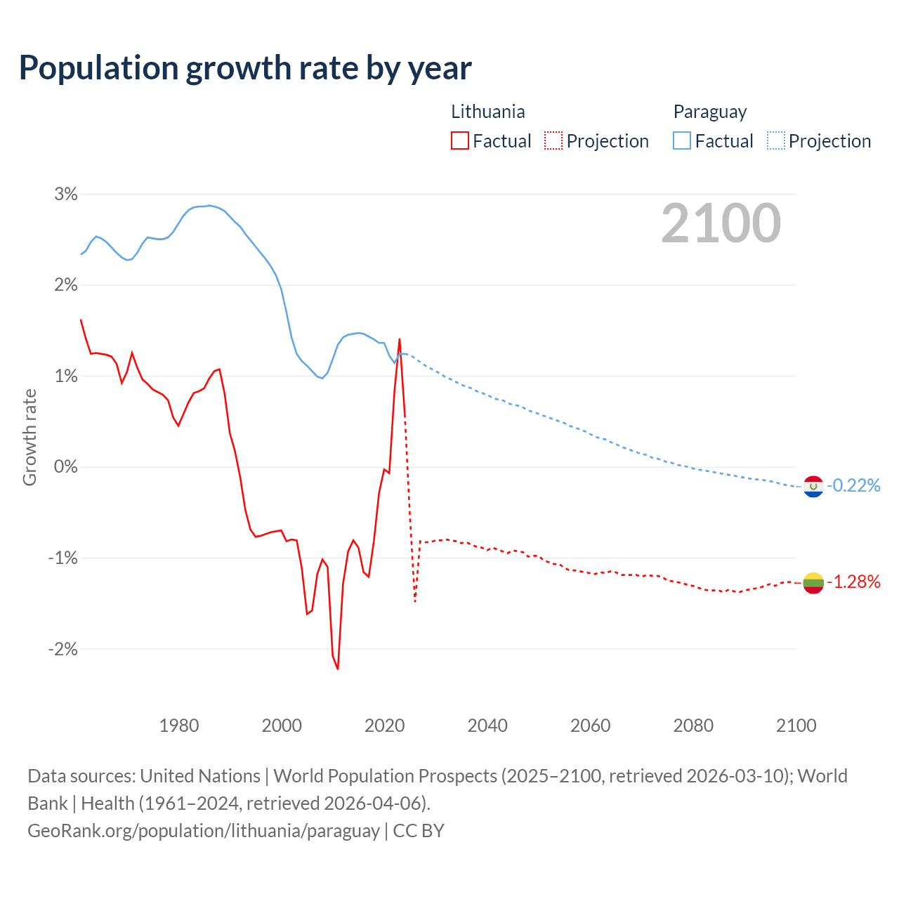 - For the last 10 years, Lithuania has had an average growth rate of -0.22% per year vs +1.34% in Paraguay.