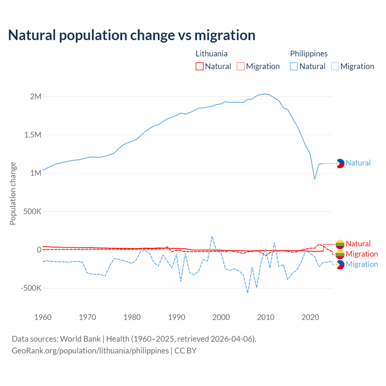 Over the last 10 years, 68.7% of the population change in Lithuania is from natural causes (a loss of 153,859 people) and 31.3% is from migration (a gain of 70,196 people). In the Philippines 88.5% is from natural causes (a gain of 14,279,705 people) and 11.5% is from migration (a loss of 1,848,117 people).