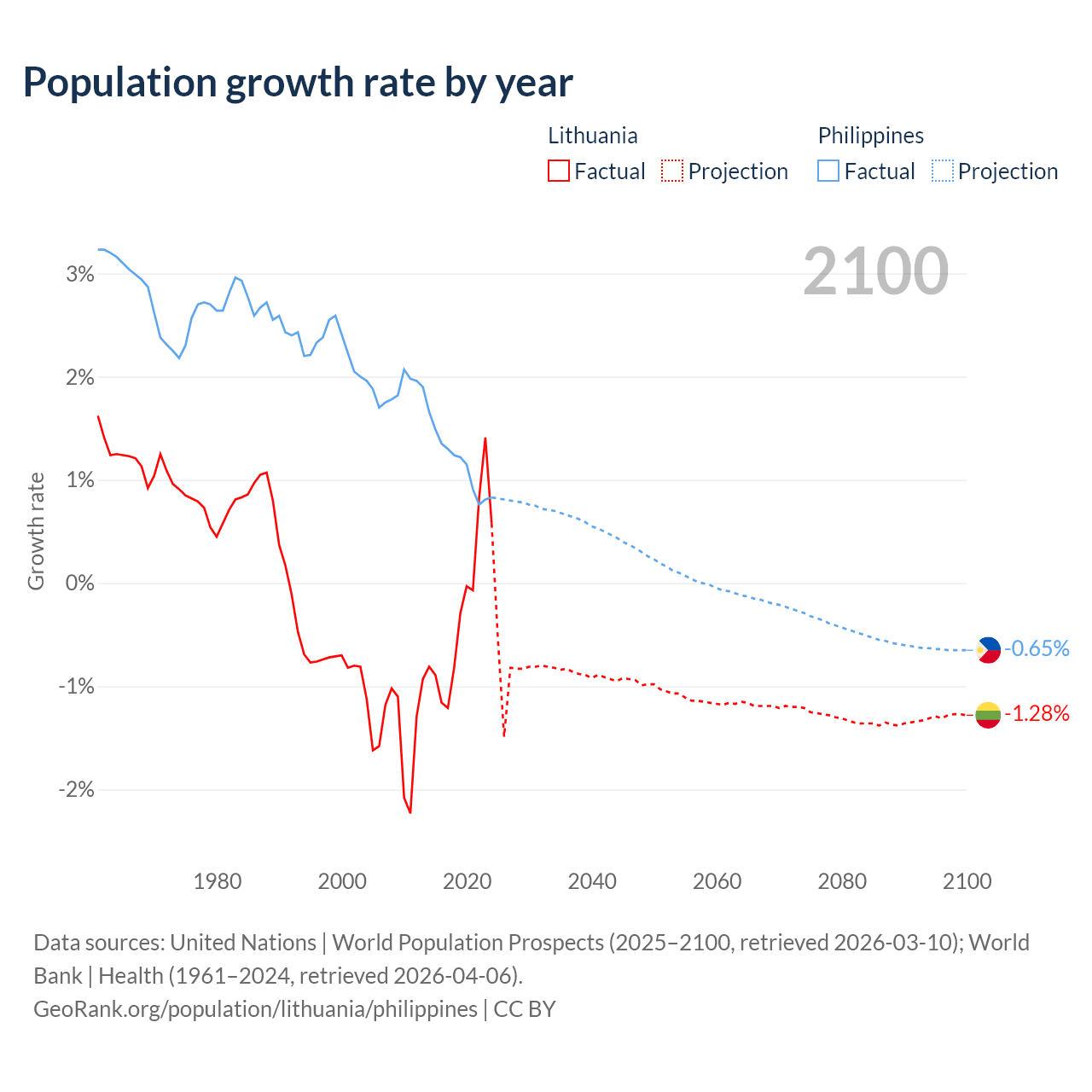 - For the last 10 years, Lithuania has had an average growth rate of -0.22% per year vs +1.16% in the Philippines.