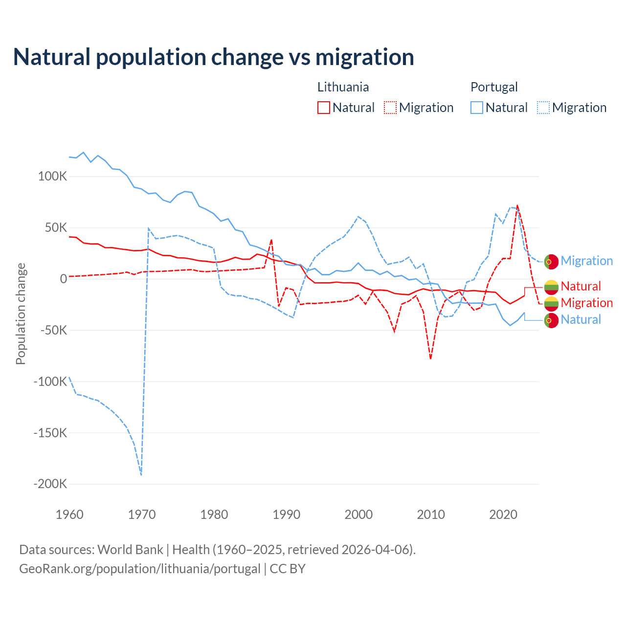 Over the last 10 years, 68.7% of the population change in Lithuania is from natural causes (a loss of 153,859 people) and 31.3% is from migration (a gain of 70,196 people). In Portugal 51% is from natural causes (a loss of 302,748 people) and 49% is from migration (a gain of 290,554 people).