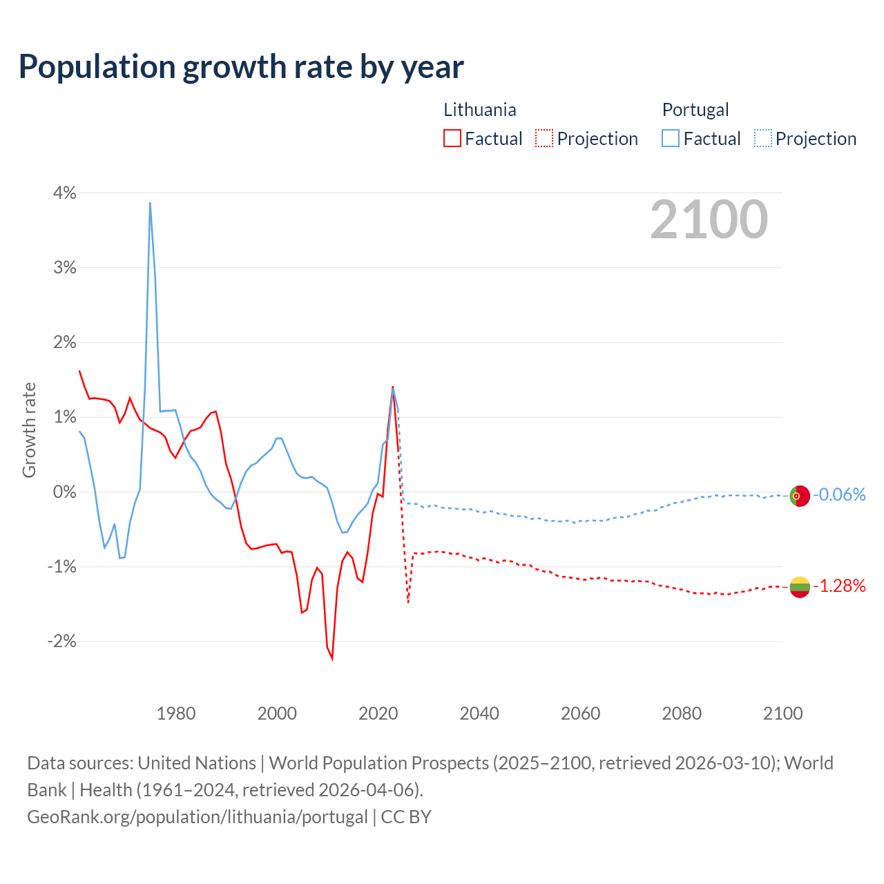 - For the last 10 years, Lithuania has had an average growth rate of -0.22% per year vs +0.21% in Portugal.