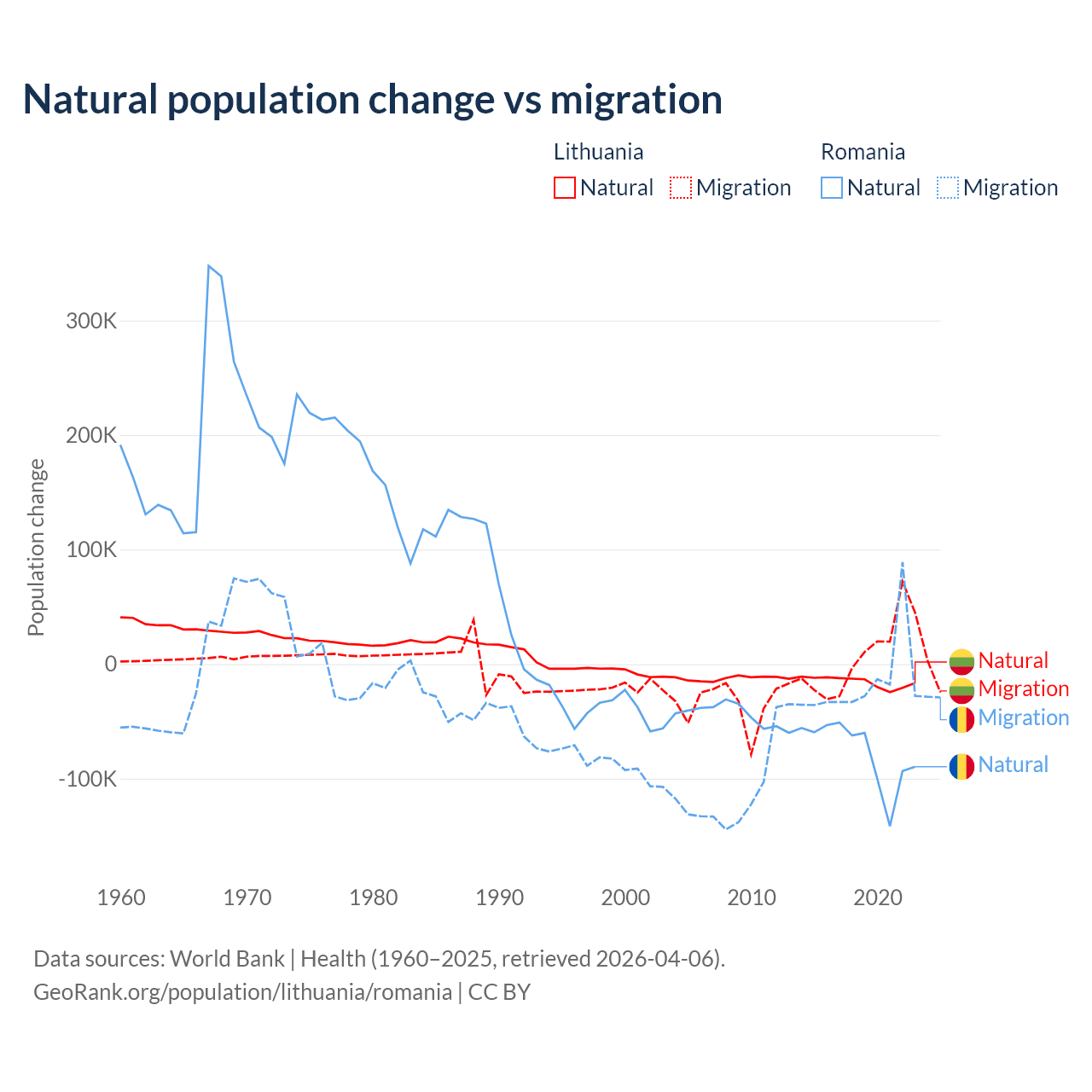 Over the last 10 years, 68.7% of the population change in Lithuania is from natural causes (a loss of 153,859 people) and 31.3% is from migration (a gain of 70,196 people). In Romania 82% is from natural causes (a loss of 766,295 people) and 18% is from migration (a loss of 167,917 people).