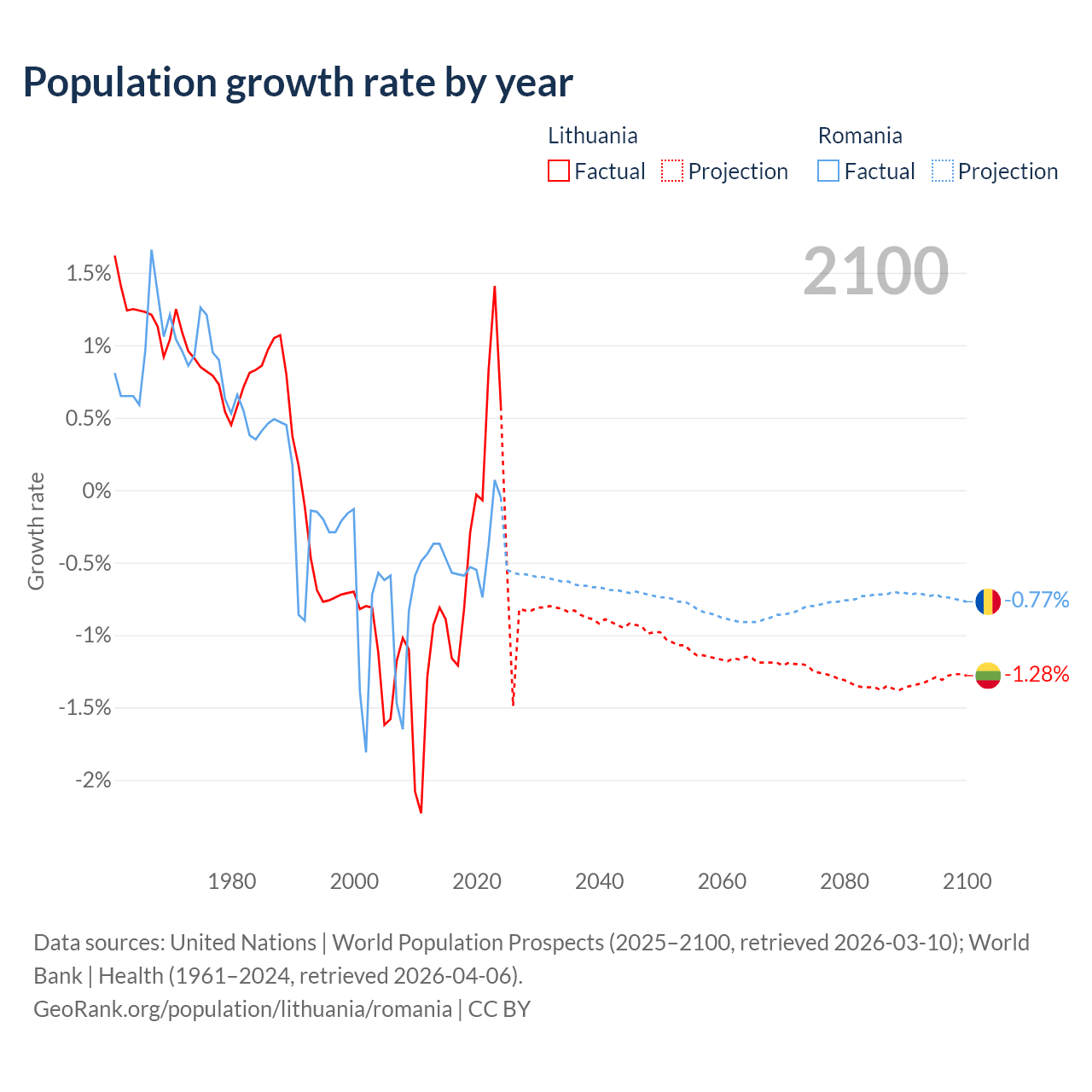 - For the last 10 years, Lithuania has had an average growth rate of -0.22% per year vs -0.43% in Romania.