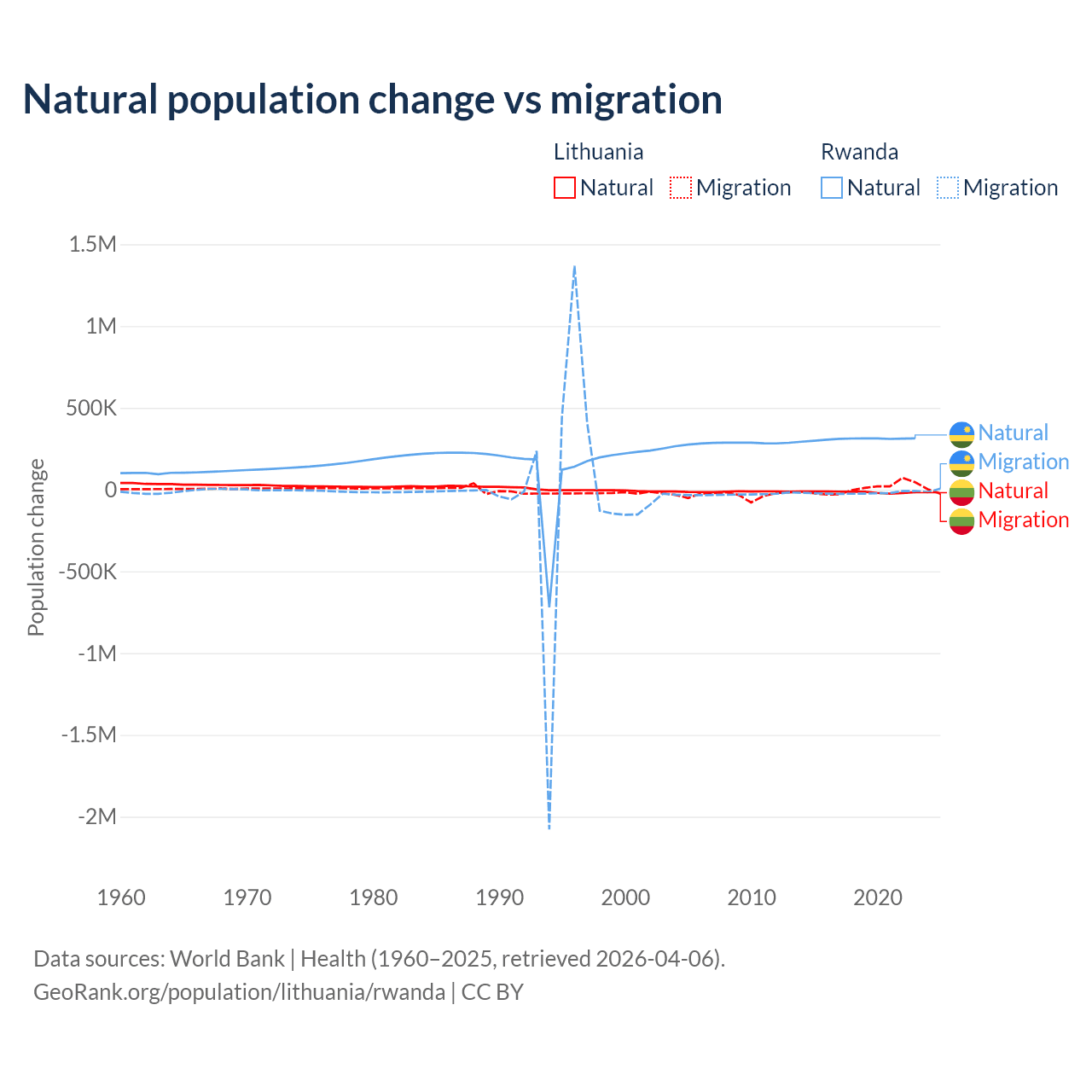 Over the last 10 years, 68.7% of the population change in Lithuania is from natural causes (a loss of 153,859 people) and 31.3% is from migration (a gain of 70,196 people). In Rwanda 93.8% is from natural causes (a gain of 3,081,296 people) and 6.18% is from migration (a loss of 203,035 people).