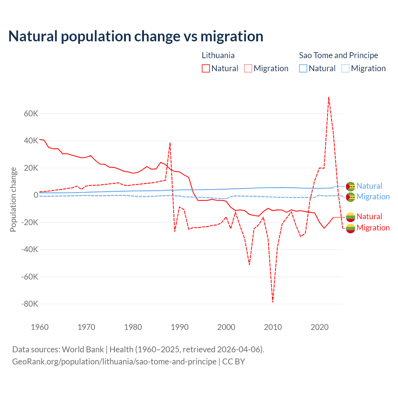 Over the last 10 years, 68.7% of the population change in Lithuania is from natural causes (a loss of 153,859 people) and 31.3% is from migration (a gain of 70,196 people). In Sao Tome and Principe 80.1% is from natural causes (a gain of 50,822 people) and 19.9% is from migration (a loss of 12,621 people).