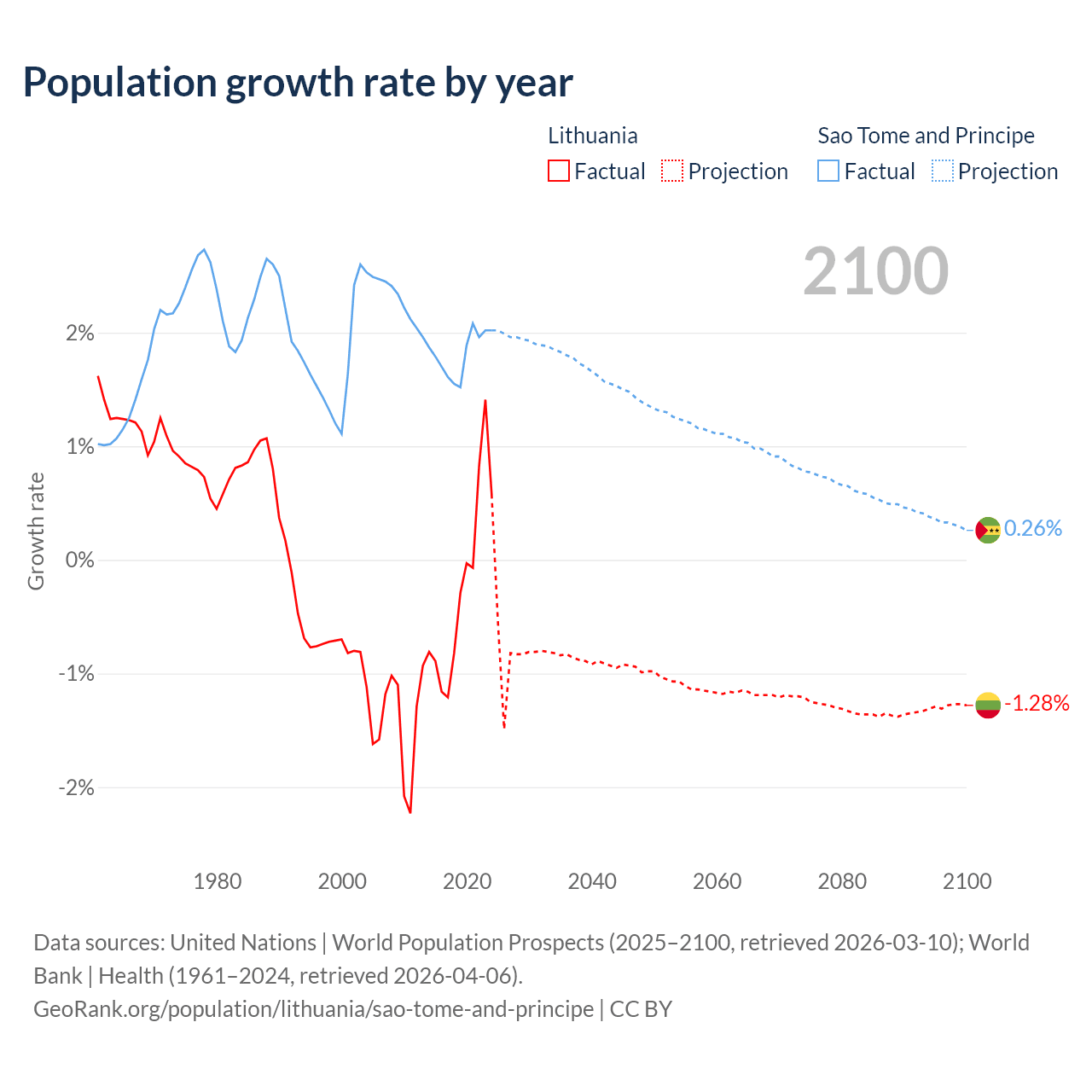 - For the last 10 years, Lithuania has had an average growth rate of -0.22% per year vs +1.82% in Sao Tome and Principe.