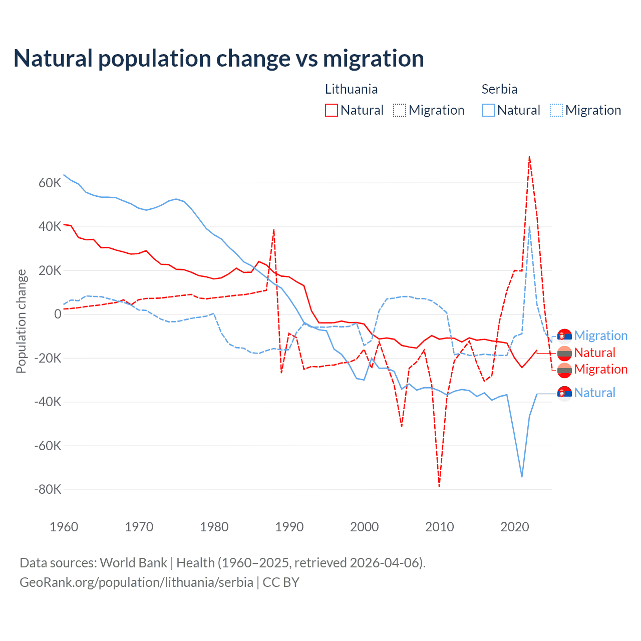 Over the last 10 years, 68.7% of the population change in Lithuania is from natural causes (a loss of 153,859 people) and 31.3% is from migration (a gain of 70,196 people). In Serbia 83.3% is from natural causes (a loss of 435,148 people) and 16.7% is from migration (a loss of 87,110 people).