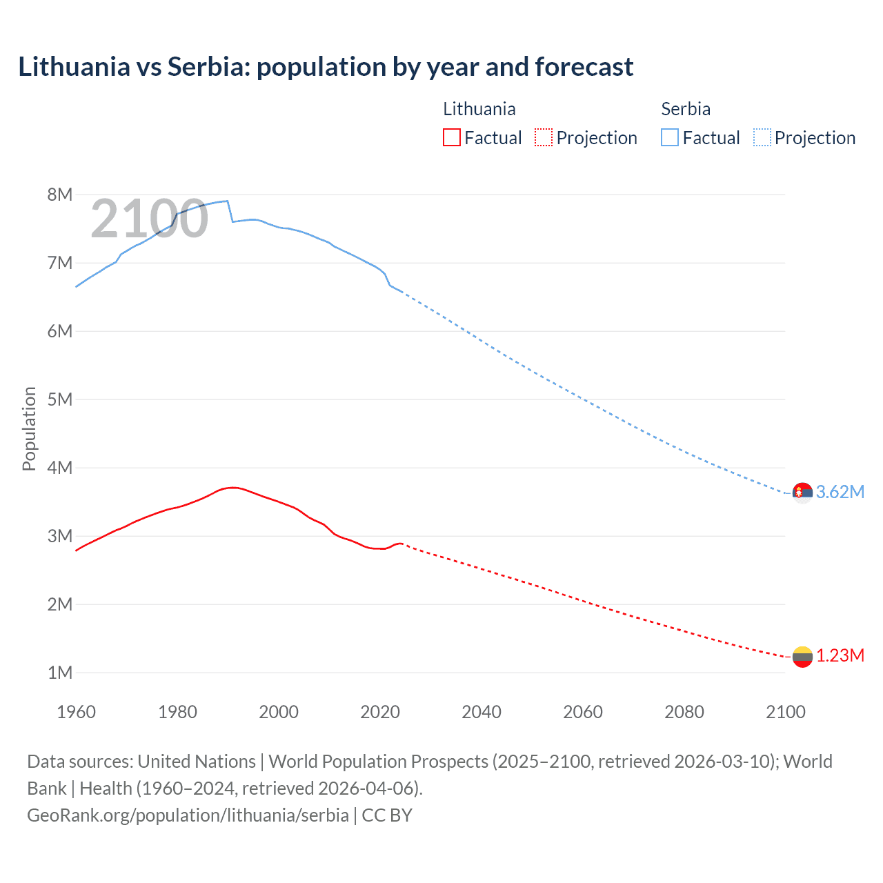 The latest officially reported population of Lithuania was 2,888,278 in 2024 vs 6,586,476 people in Serbia in 2024. In 2026, based on the adjusted UN estimation, the current Lithuania's population is 2,829,914 people compared to 6,494,521 in Serbia.