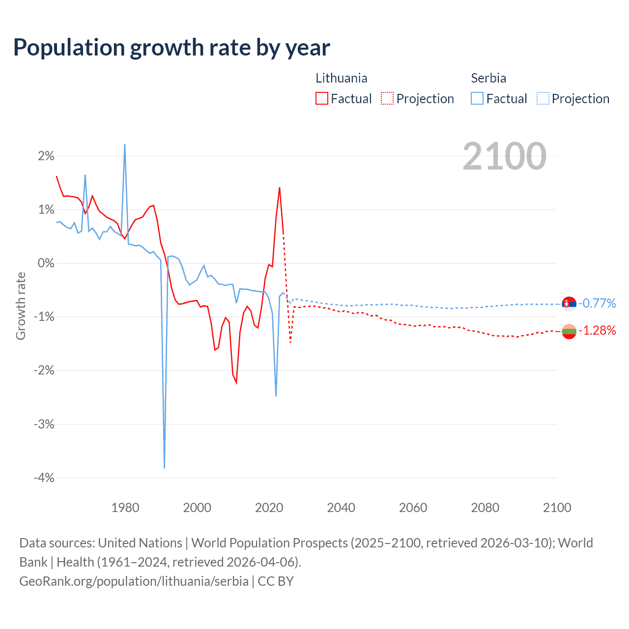 - For the last 10 years, Lithuania has had an average growth rate of -0.22% per year vs -0.76% in Serbia.