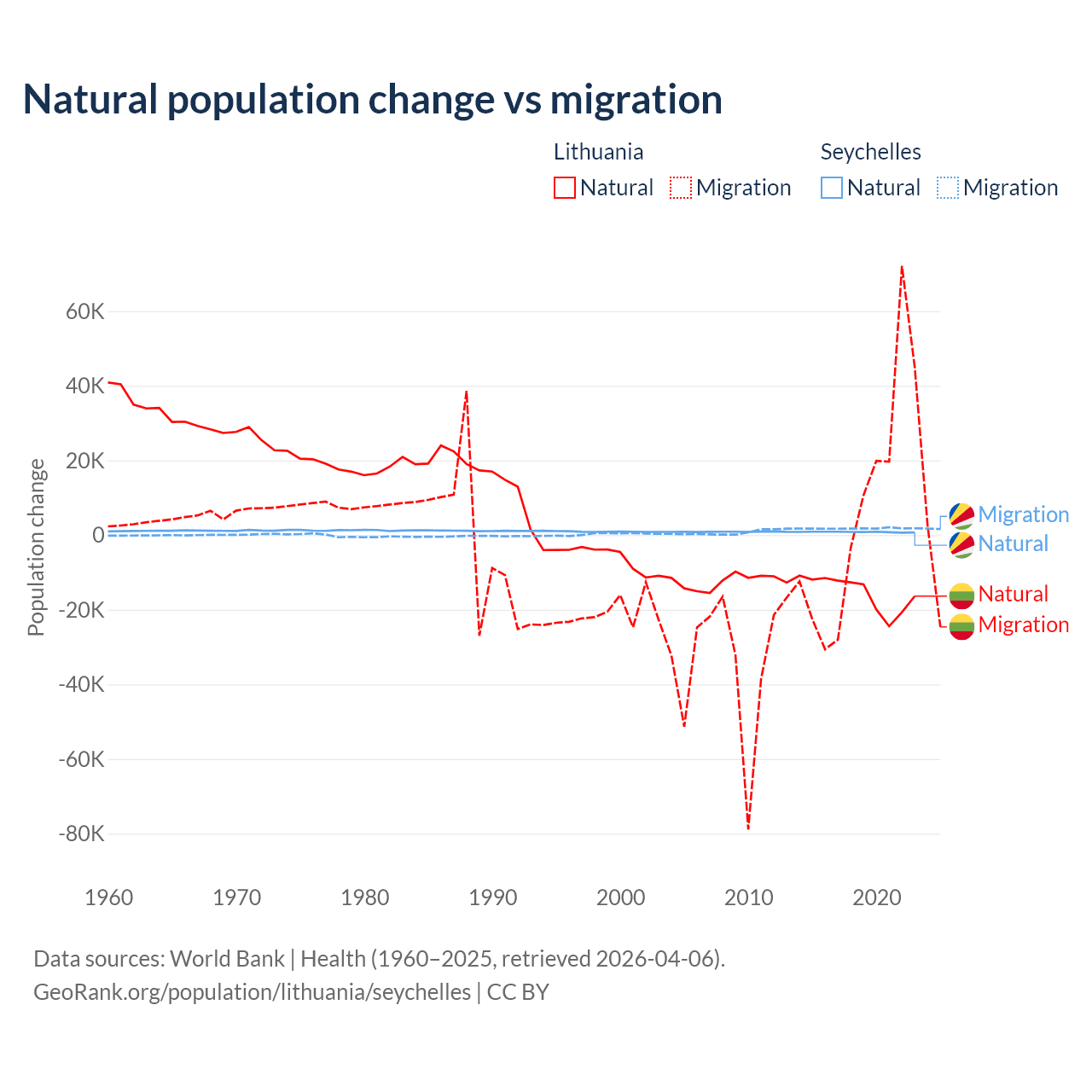 - Since 2006, the population of Lithuania has decreased from 3.27M people to 2.83M (13.5% decline), while the Seychelles has grown from 84.6K to 126K (49.3% growth).