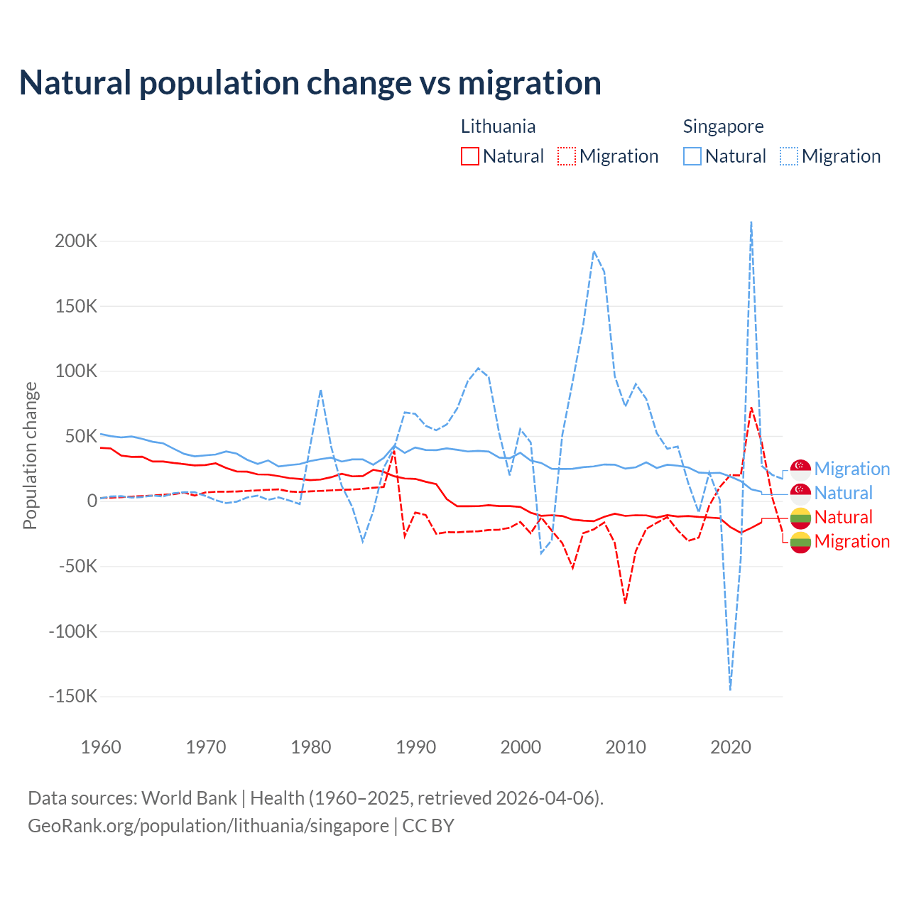 Over the last 10 years, 68.7% of the population change in Lithuania is from natural causes (a loss of 153,859 people) and 31.3% is from migration (a gain of 70,196 people). In Singapore 54.8% is from natural causes (a gain of 195,953 people) and 45.2% is from migration (a gain of 161,805 people).