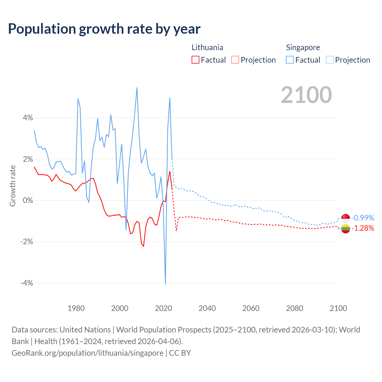 - For the last 10 years, Lithuania has had an average growth rate of -0.22% per year vs +1.04% in Singapore.
