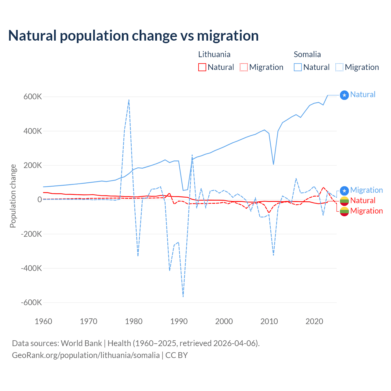 Over the last 10 years, 68.7% of the population change in Lithuania is from natural causes (a loss of 153,859 people) and 31.3% is from migration (a gain of 70,196 people). In Somalia 94.4% is from natural causes (a gain of 5,270,105 people) and 5.58% is from migration (a gain of 311,487 people).