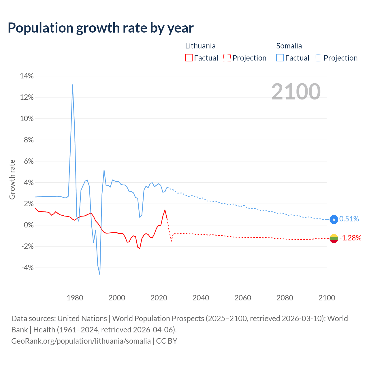 - For the last 10 years, Lithuania has had an average growth rate of -0.22% per year vs +3.61% in Somalia.