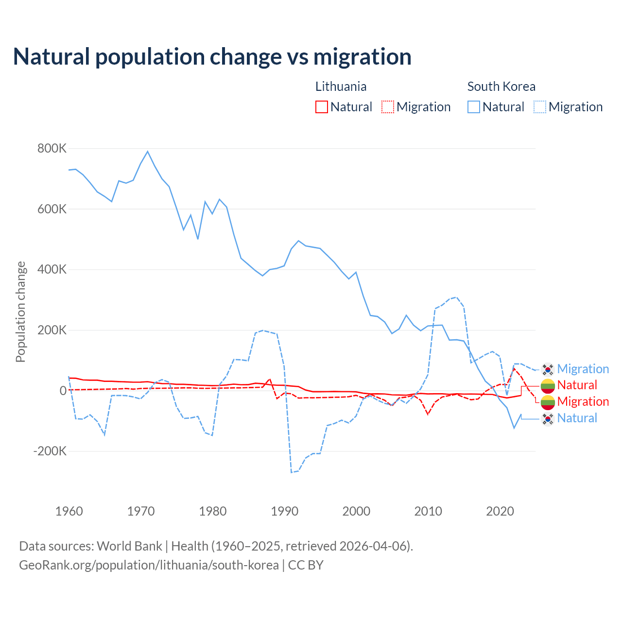 Over the last 10 years, 68.7% of the population change in Lithuania is from natural causes (a loss of 153,859 people) and 31.3% is from migration (a gain of 70,196 people). In South Korea 17.6% is from natural causes (a gain of 277,215 people) and 82.4% is from migration (a gain of 1,298,356 people).