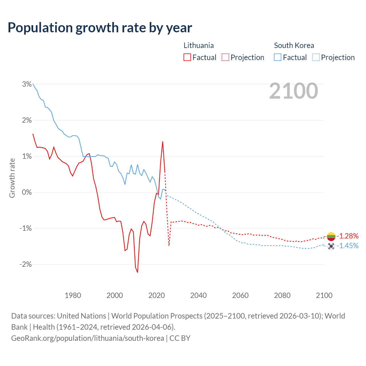 - For the last 10 years, Lithuania has had an average growth rate of -0.22% per year vs +0.24% in South Korea.