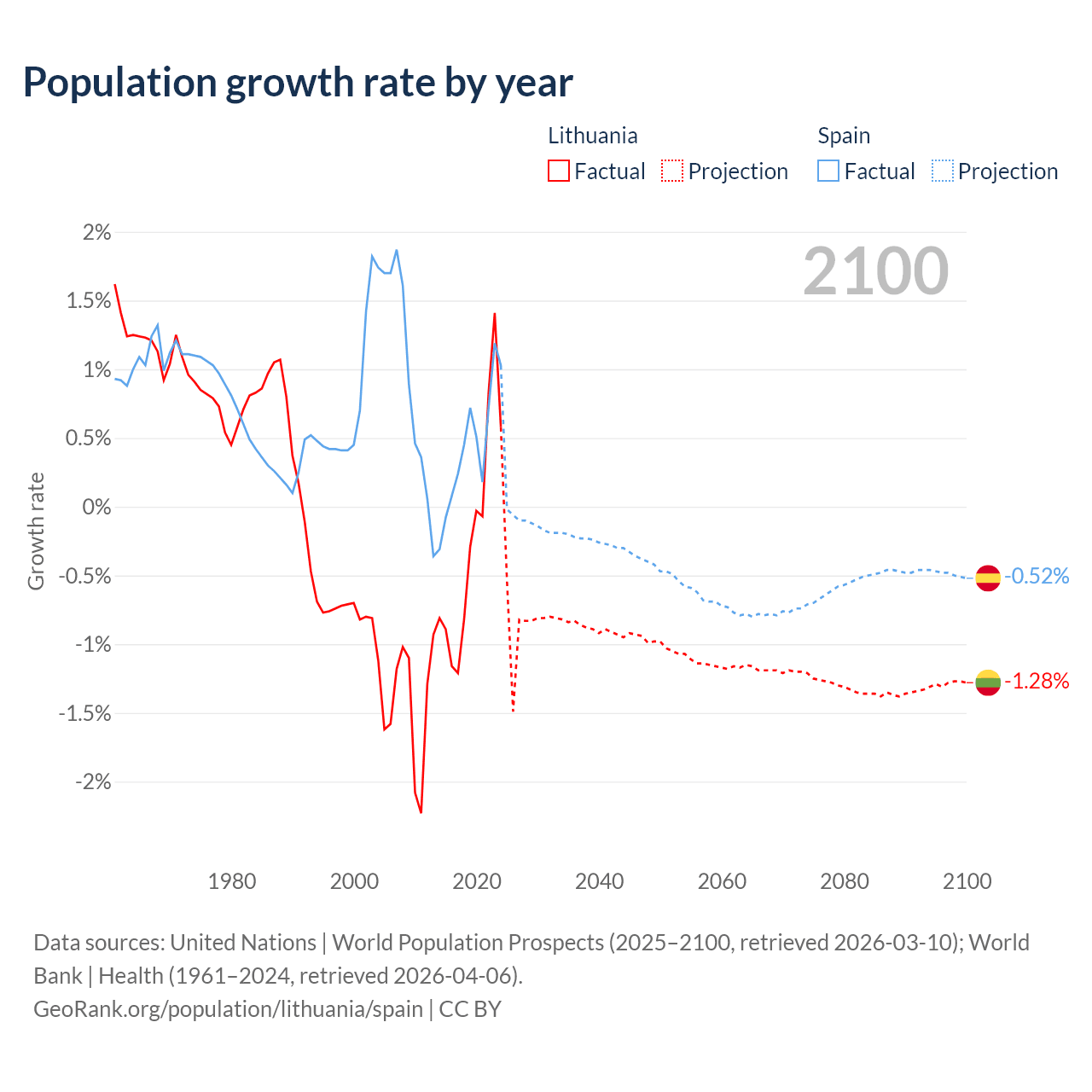 - For the last 10 years, Lithuania has had an average growth rate of -0.22% per year vs +0.43% in Spain.