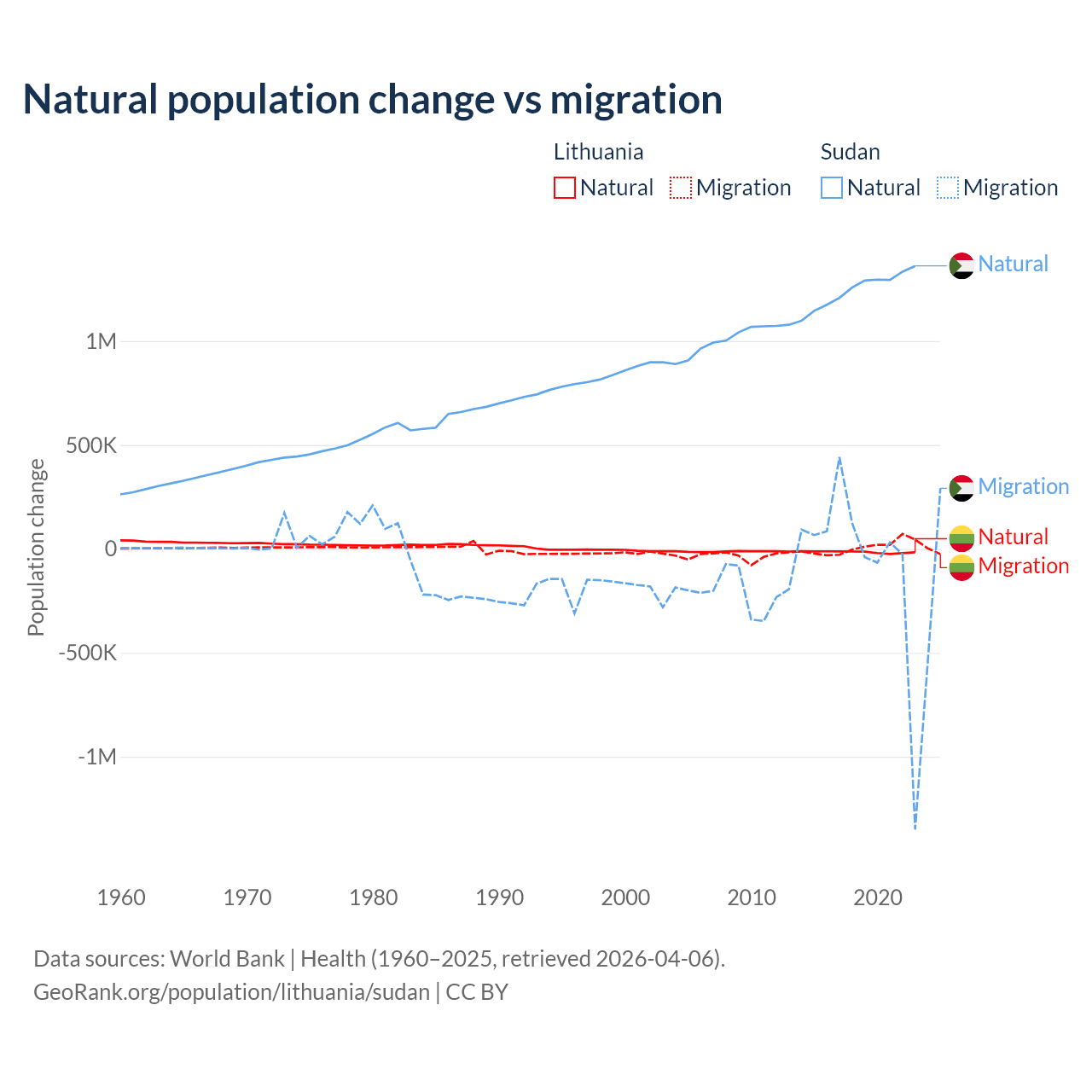Over the last 10 years, 68.7% of the population change in Lithuania is from natural causes (a loss of 153,859 people) and 31.3% is from migration (a gain of 70,196 people). In Sudan 95.1% is from natural causes (a gain of 12,459,977 people) and 4.88% is from migration (a loss of 639,596 people).