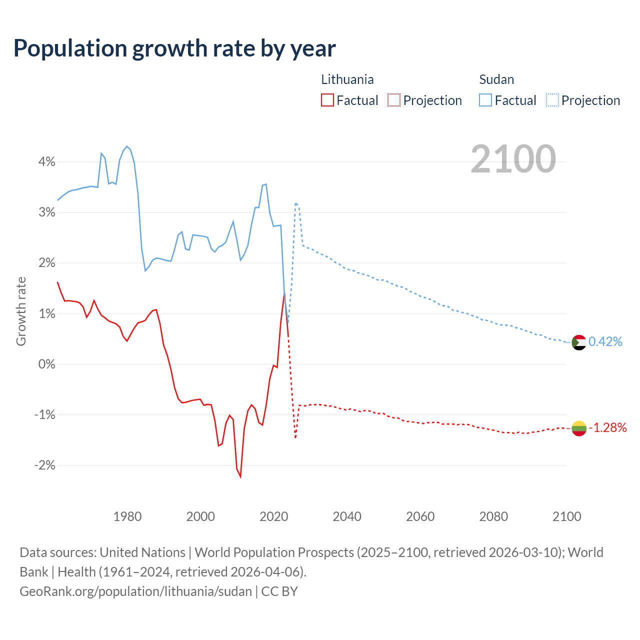 - For the last 10 years, Lithuania has had an average growth rate of -0.22% per year vs +2.67% in Sudan.