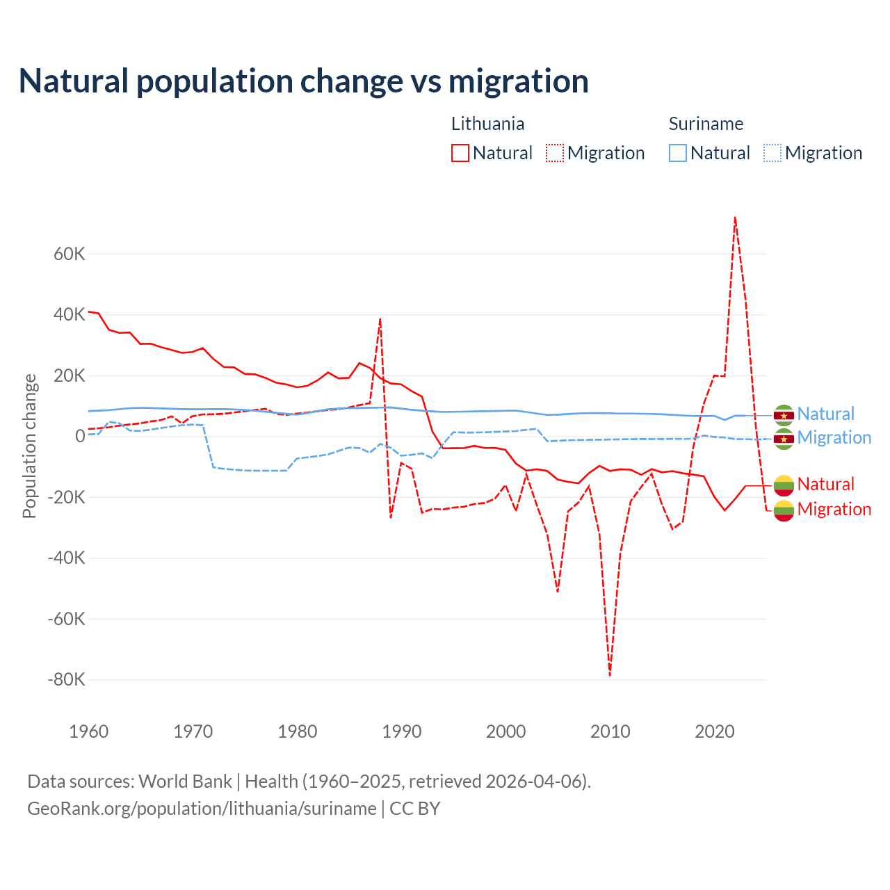 Over the last 10 years, 68.7% of the population change in Lithuania is from natural causes (a loss of 153,859 people) and 31.3% is from migration (a gain of 70,196 people). In Suriname 90.3% is from natural causes (a gain of 66,709 people) and 9.72% is from migration (a loss of 7,185 people).