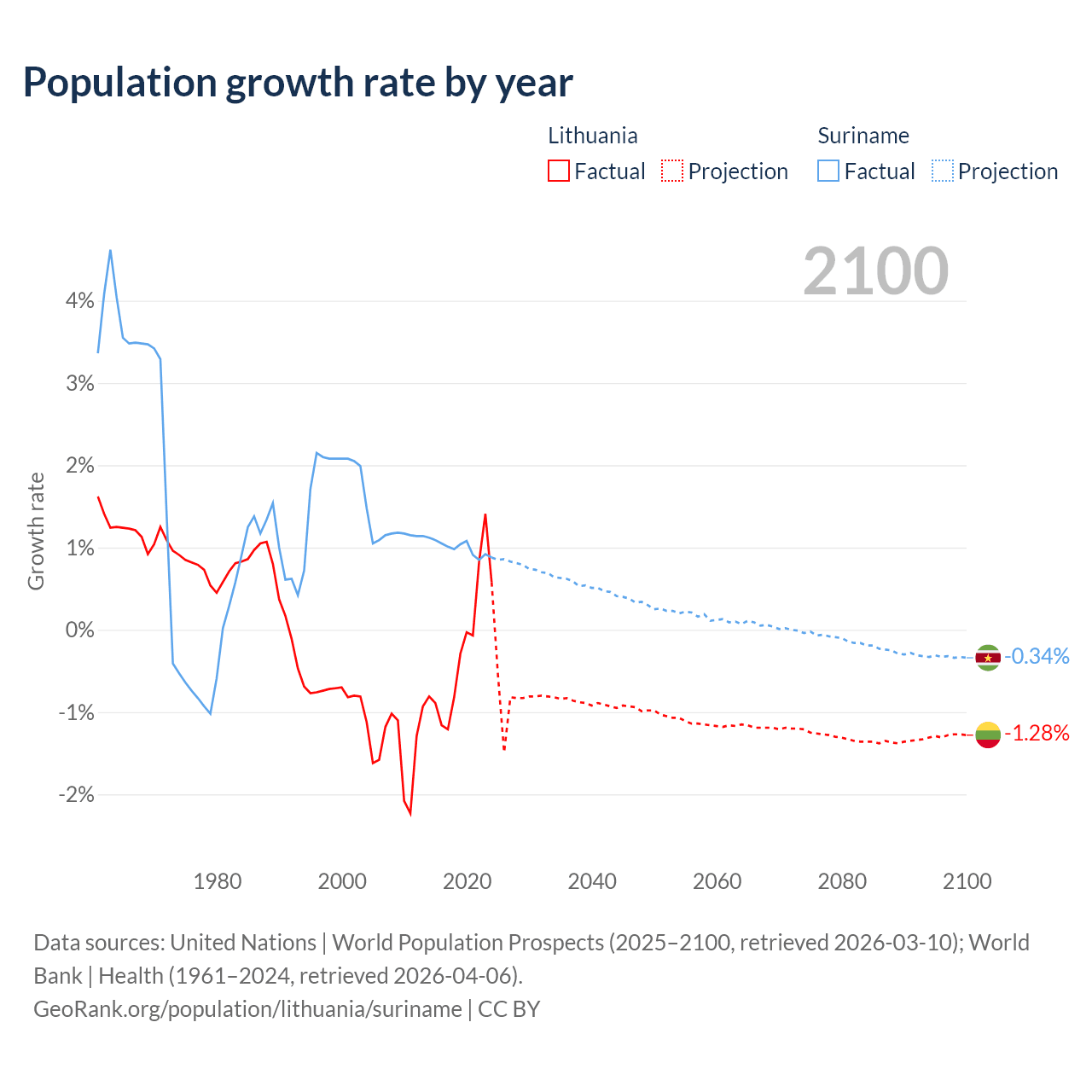 - For the last 10 years, Lithuania has had an average growth rate of -0.22% per year vs +0.99% in Suriname.