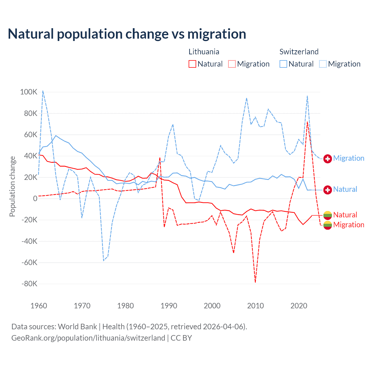 Over the last 10 years, 68.7% of the population change in Lithuania is from natural causes (a loss of 153,859 people) and 31.3% is from migration (a gain of 70,196 people). In Switzerland 21.6% is from natural causes (a gain of 165,354 people) and 78.4% is from migration (a gain of 600,145 people).