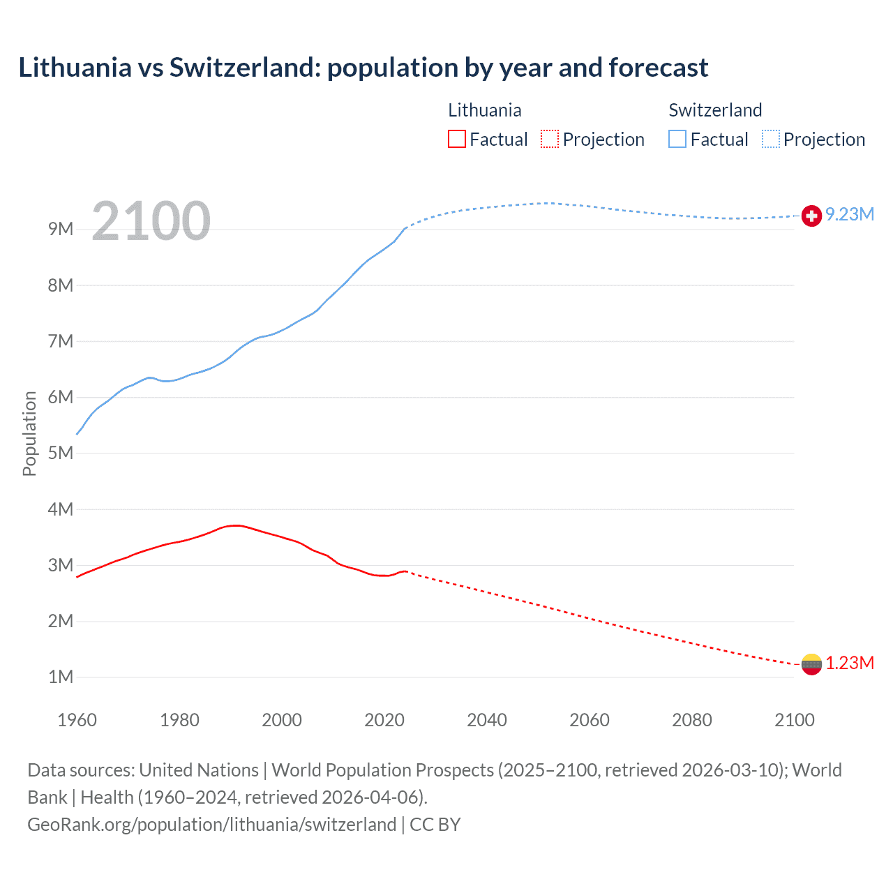 Lithuania vs Switzerland: population by year and forecast