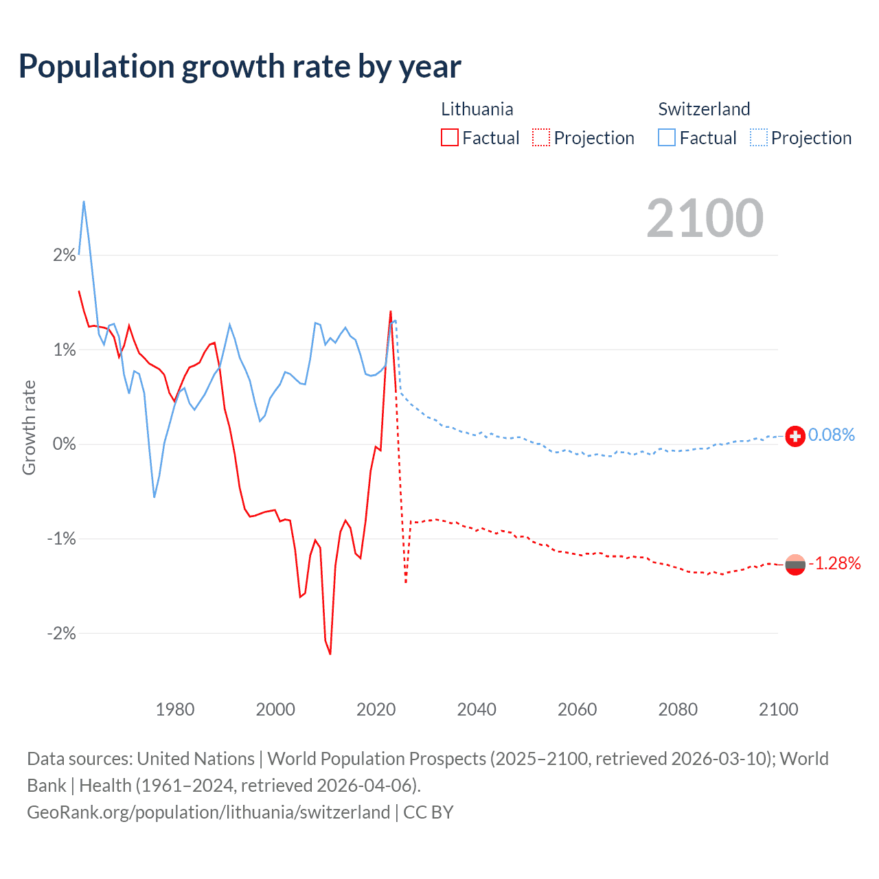 - For the last 10 years, Lithuania has had an average growth rate of -0.22% per year vs +0.98% in Switzerland.
