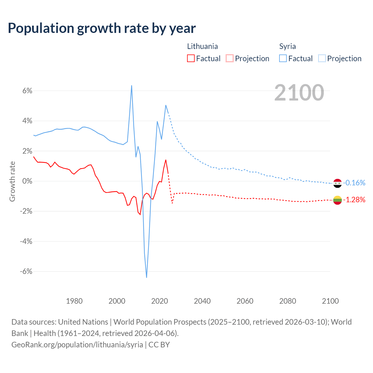 - For the last 10 years, Lithuania has had an average growth rate of -0.22% per year vs +1.25% in Syria.