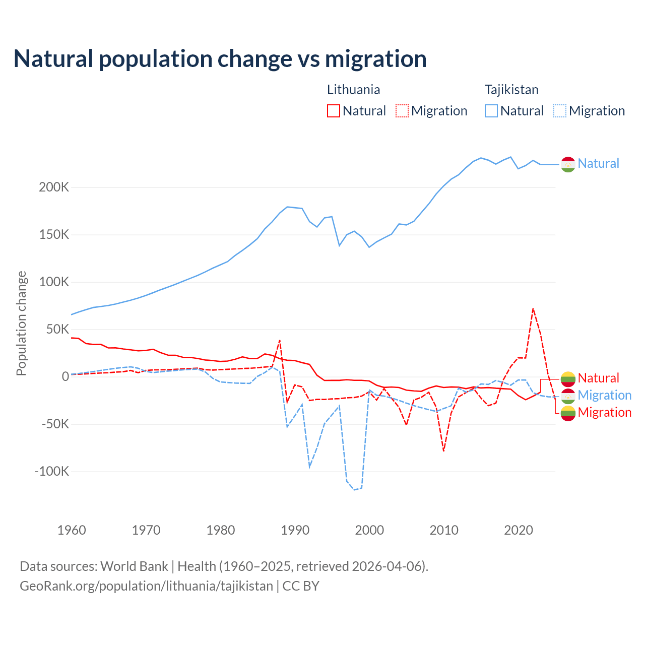 Over the last 10 years, 68.7% of the population change in Lithuania is from natural causes (a loss of 153,859 people) and 31.3% is from migration (a gain of 70,196 people). In Tajikistan 96% is from natural causes (a gain of 2,266,045 people) and 3.95% is from migration (a loss of 93,205 people).