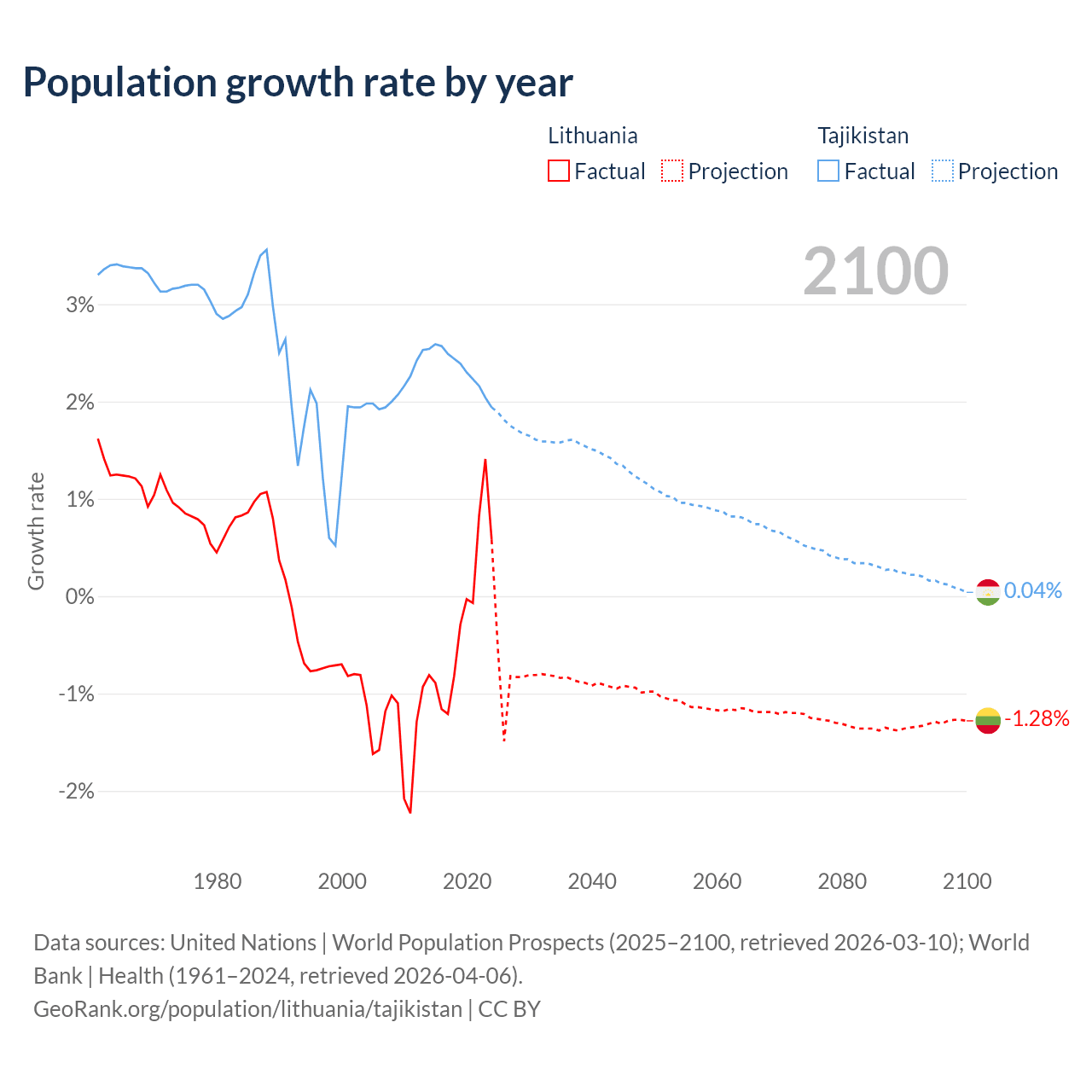 - For the last 10 years, Lithuania has had an average growth rate of -0.22% per year vs +2.33% in Tajikistan.